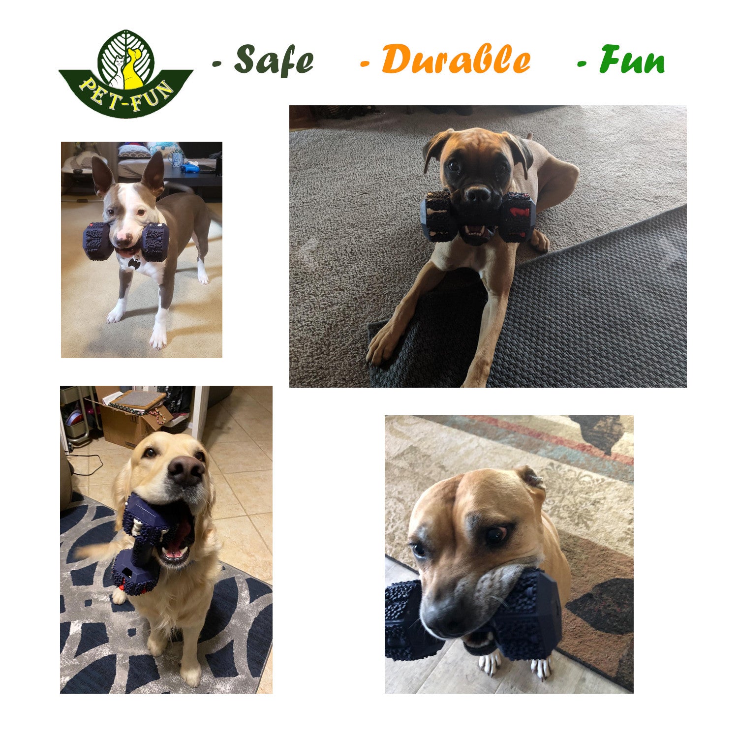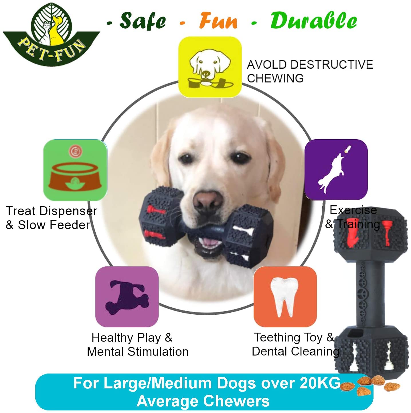 - DURABLE: While no dog toy is truly indestructible, you can be assured our material offers the top durability in the market because of our leading proprietary technology. In addition to excessive pulling and tearing tests completed in lab, this large dumbbell has also been widely tested and proven durable for all average chewers and 92% of power chewers. In addition, we recommend the 8% extremely focused and determined aggressive chewers to enjoy the toy with kibbles & treats filled under supervision/guidance, or by playing interactively with dog parents.