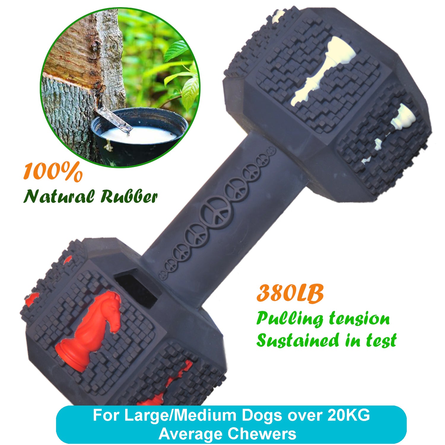 - FUN: This large dumbbell is made of super flexible & bouncy natural rubber. It rolls, bends, twists and bounces easily & erratically when being played, chased and chewed. It works as a treat dispenser with plenty of capacity for a large chewer. It dispenses kibbles only at specific positions, which can be identified by the decorated chess pieces and works as a mental enrichment challenge to your intelligent and beloved dog.