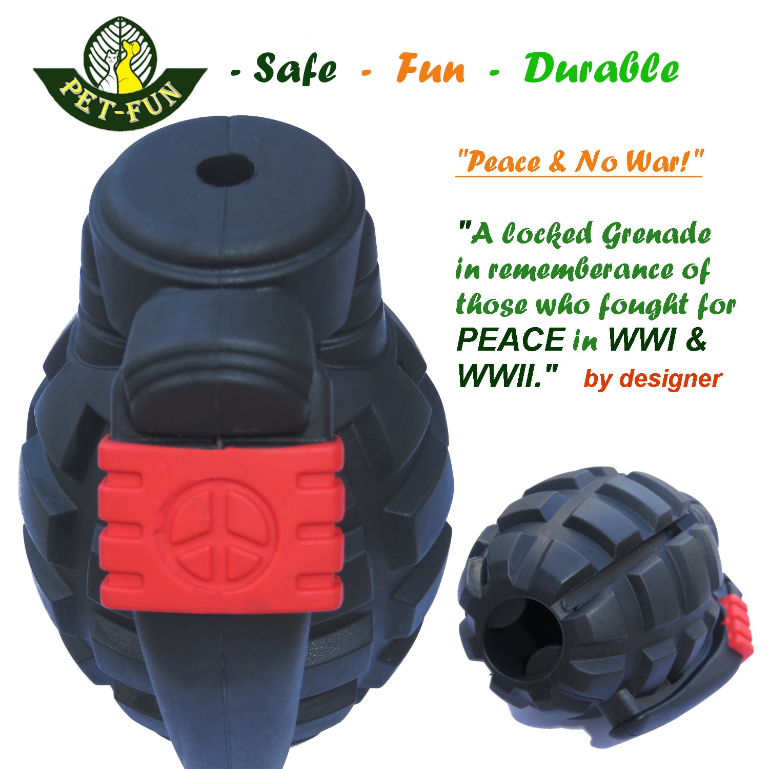 This dog toy anti-war Grenade was designed as one of our ‘World Peace’ series in remembrance of WWI and WWII, with a lock carrying the Peace Sign. There are two colours and two flavours to choose from: Green(Pineapple Flavor) and Black(Bacon Flavor).