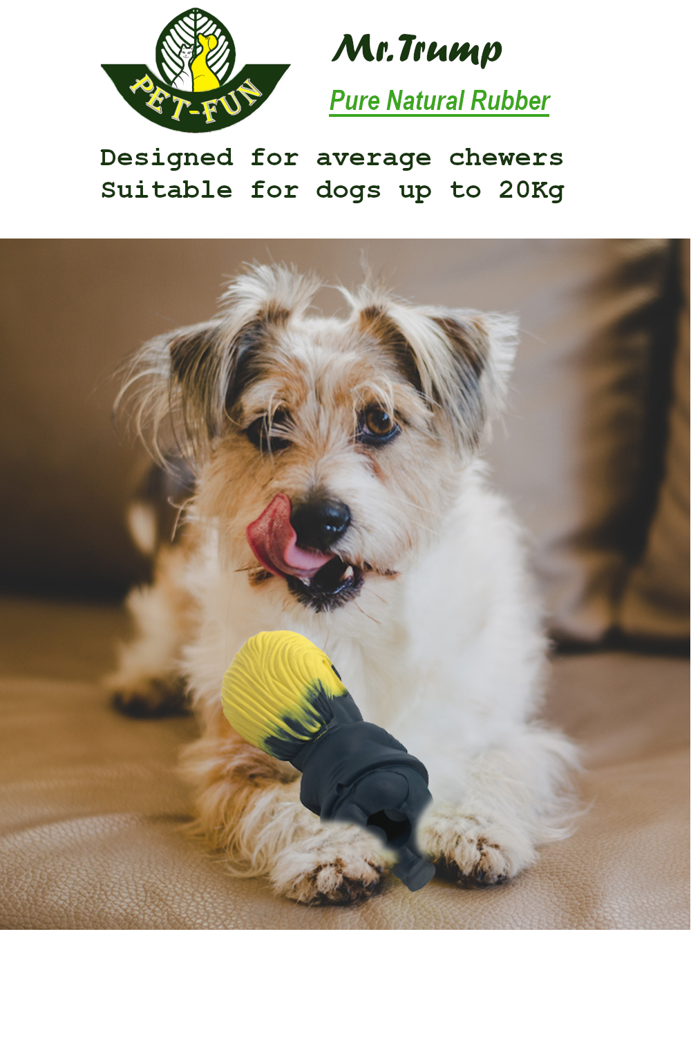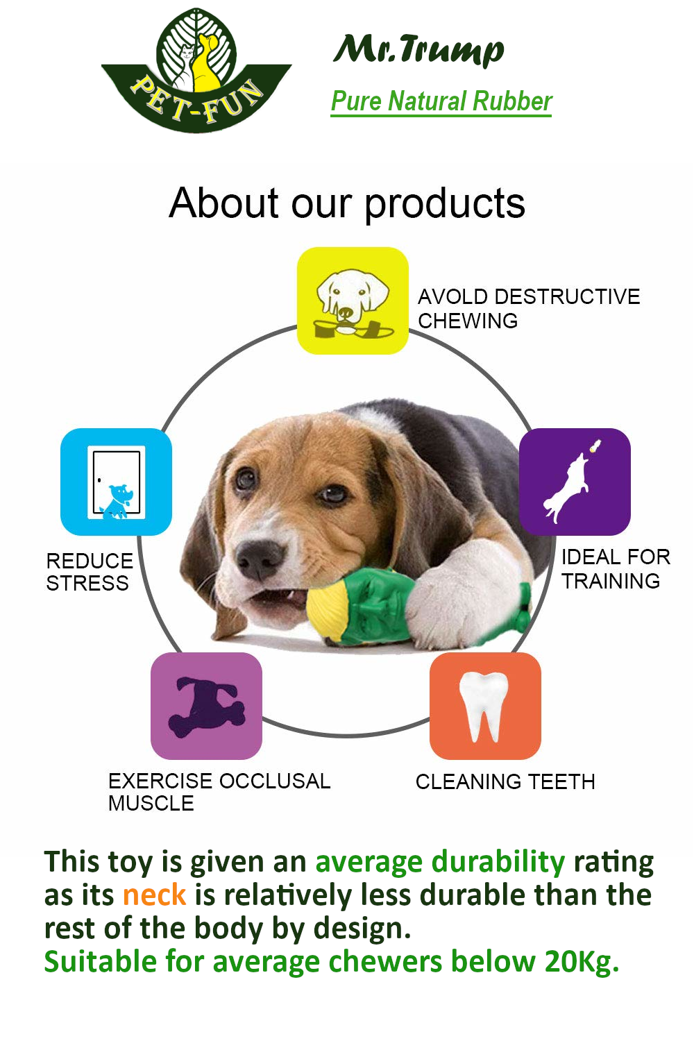 Pet-Fun natural rubber toys are made from 100% natural rubber. They are non-toxic, tested against FDA standards and of food-grade. If ingested, they are less likely to cause any harm comparing to their synthetic counterparts.