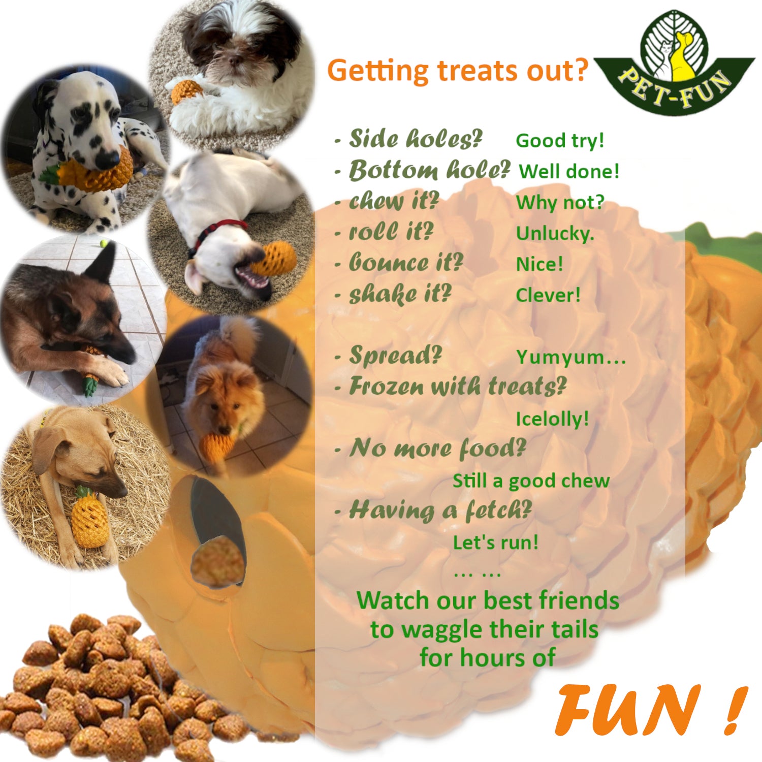 2. FUN. It serves as a chew toy, a slow feeder, a treat dispenser, a boredom puzzle toy, and a fetch toy. It can be frozen and is dishwasher safe. Watching our best friend wagging their tails, getting the treats out, or just enjoying a satisfying chew is great fun.
