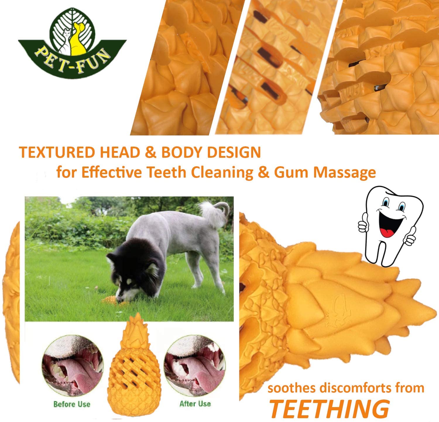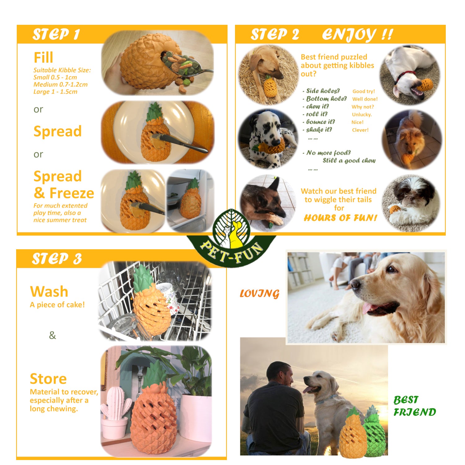 - ♥ Safe, Fun, can be Frozen and Easy to Clean: Made from food-grade natural rubber and tested against FDA standard to meet the highest safety measure, and with anti-bacteria agent built-in, this uniquely designed pineapple gives you peace of mind for your beloved dog. It can serve as a chew toy, a frozen peanut butter 'ice-lolly', a fetch toy, a food dispensing toy, and great for training and exercise. It can be easily washed by rinse or dishwasher.