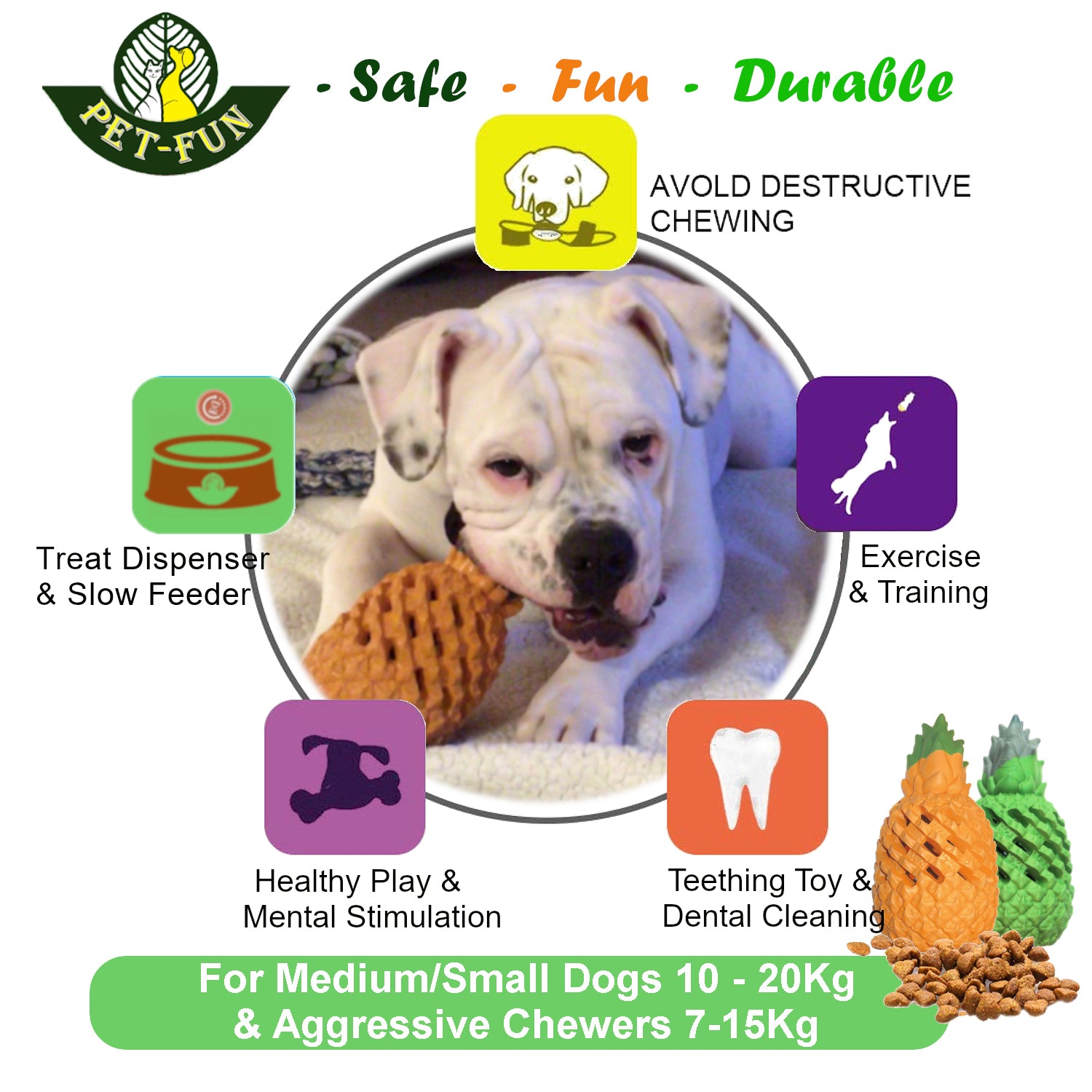 - ♥ Suitable for medium & small dogs up to 20Kg. 2 pack indestructible dog chew toy pineapple, rolls and bounces erratically when played & chased, satisfies dogs’ instinctual needs for chewing & play, provides mental stimulation, beating boredom, destructive chewing, & separation anxiety.